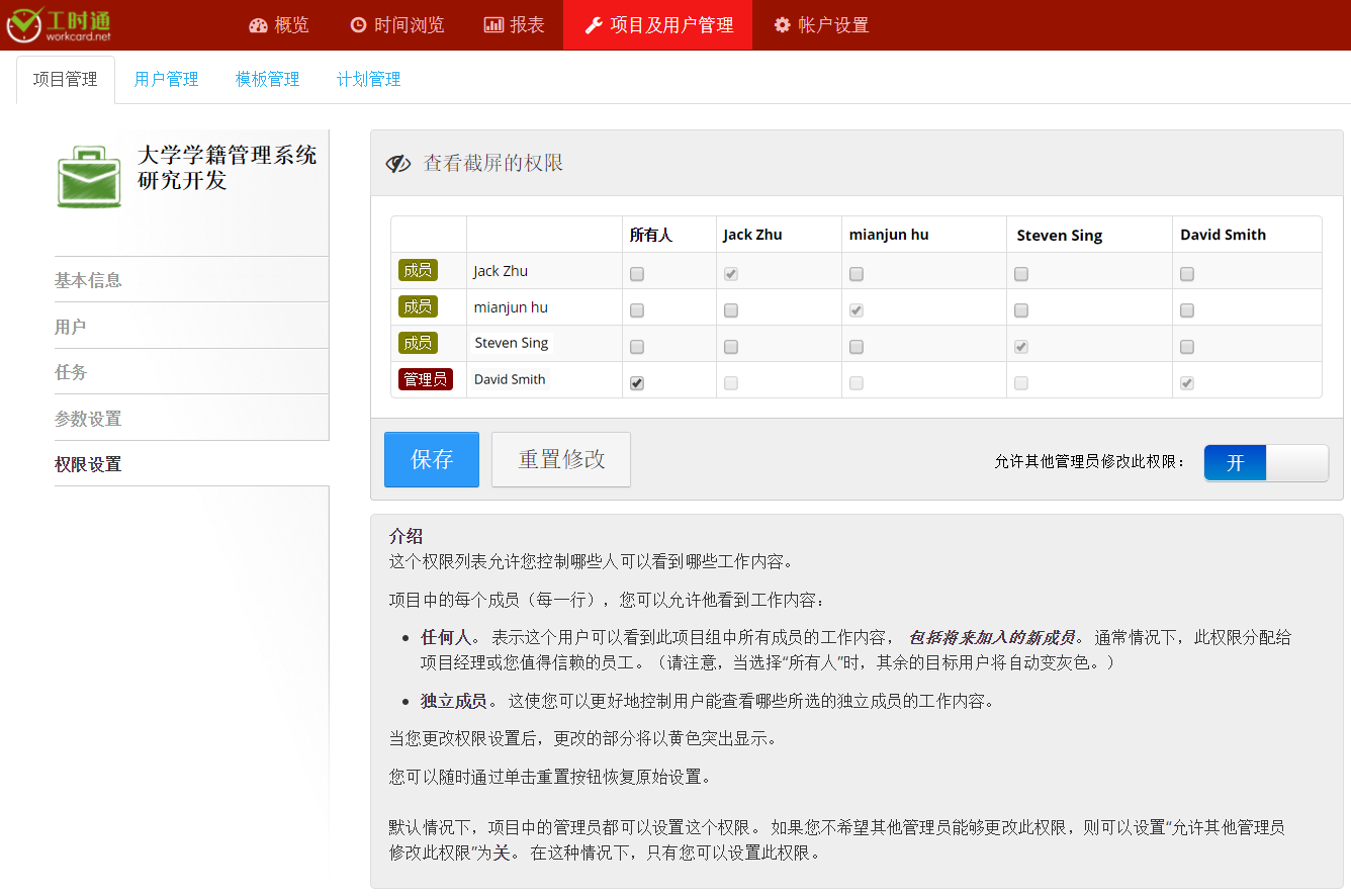 在工时通中,你可以将团队成员分到不同的项目和赋以不同的任务,这样就可以轻松的管理你的团队。每个成员只能访问他们被分配的项目,并对相关任务记录工作时间。作为项目经理,你可以管理所有项目,查阅各个项目和任务的记录时间。